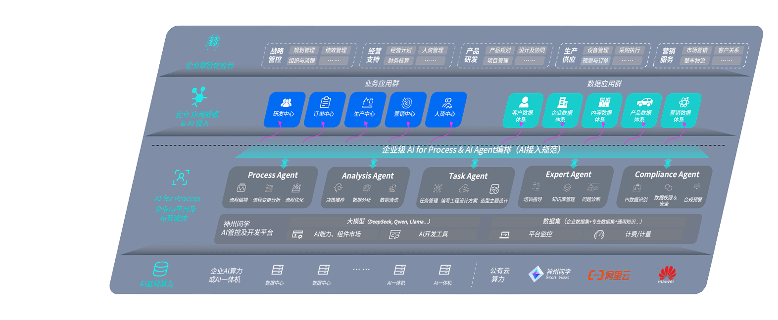 端到端的一站式AI工作空间深度融合了从企业战略规划到日常经营的全流程业务板块,,,定向解决车企内部领域多、、、、部门多、、链条长、、场景碎片化等难题,,支持车企快速构建以AI为核心的生产力写作体系,,,实现任务执行与AI能力的无缝集成与交互