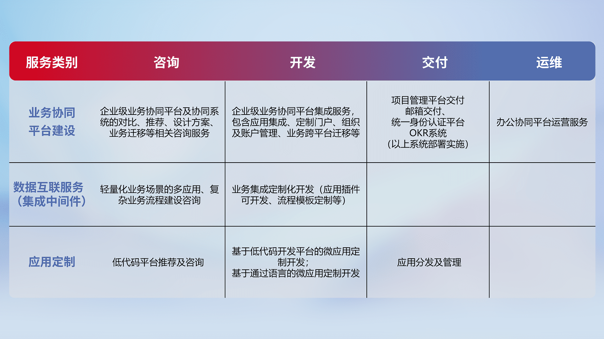 针对钉钉、、、、企微、、IDaas等平台级产品提供产品的规划、、、、方案、、、、交付、、定制化开发等服务,,,,实现如统一协同办公、、、、智能客户服务、、、、混合会议管理、、、智能数据查询、、等业务场景,,实现数字化转型。。