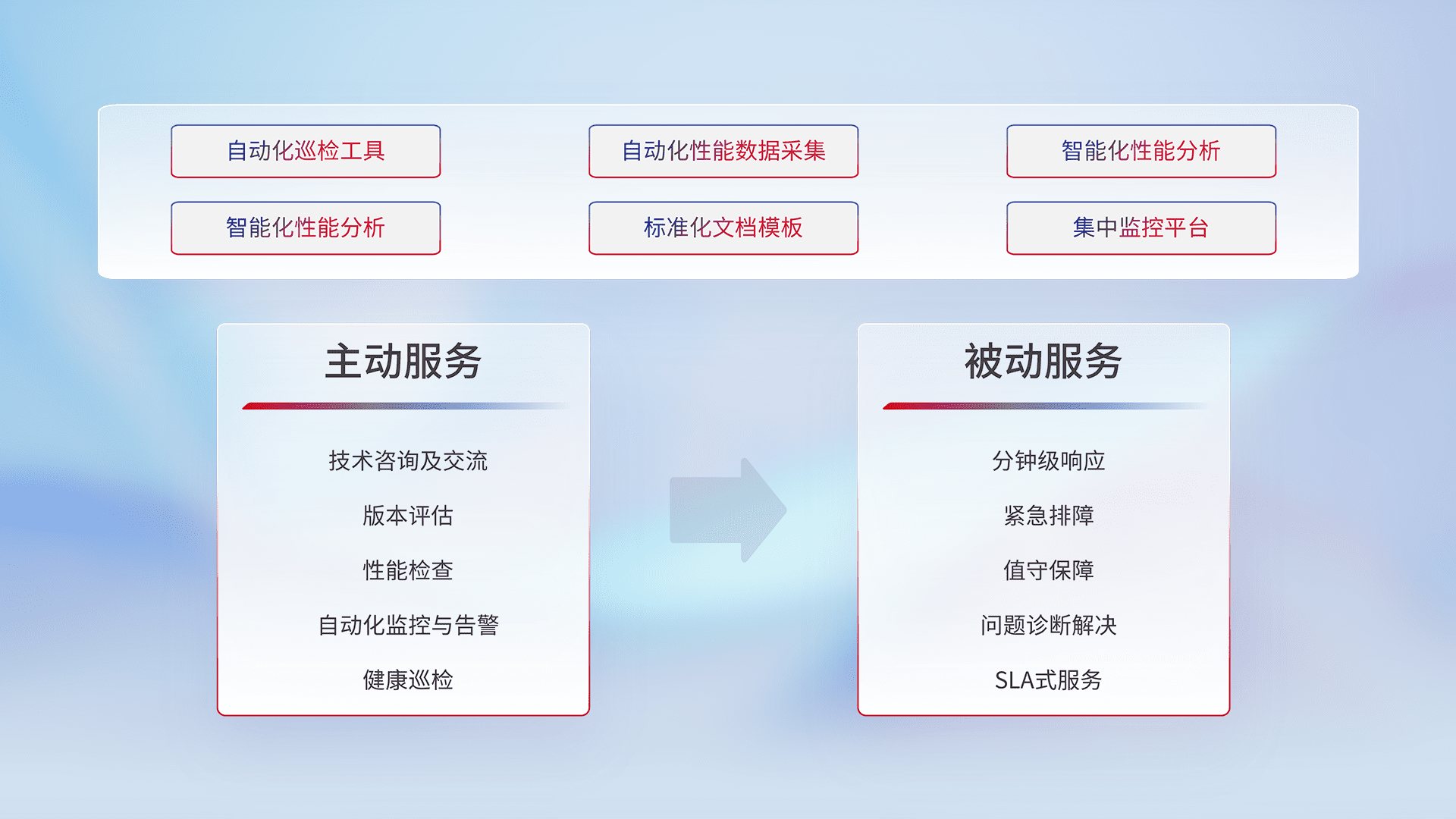 智能化工具和标准化文档,,,,保障服务质量,,,提供主动服务(包含技术咨询、、、、版本评估、、性能检查、、自动化监控与告警、、、健康巡检)和被动服务包含(分钟级响应、、紧急排障、、、值守保障、、、、问题诊断解决、、SLA服务)。。。